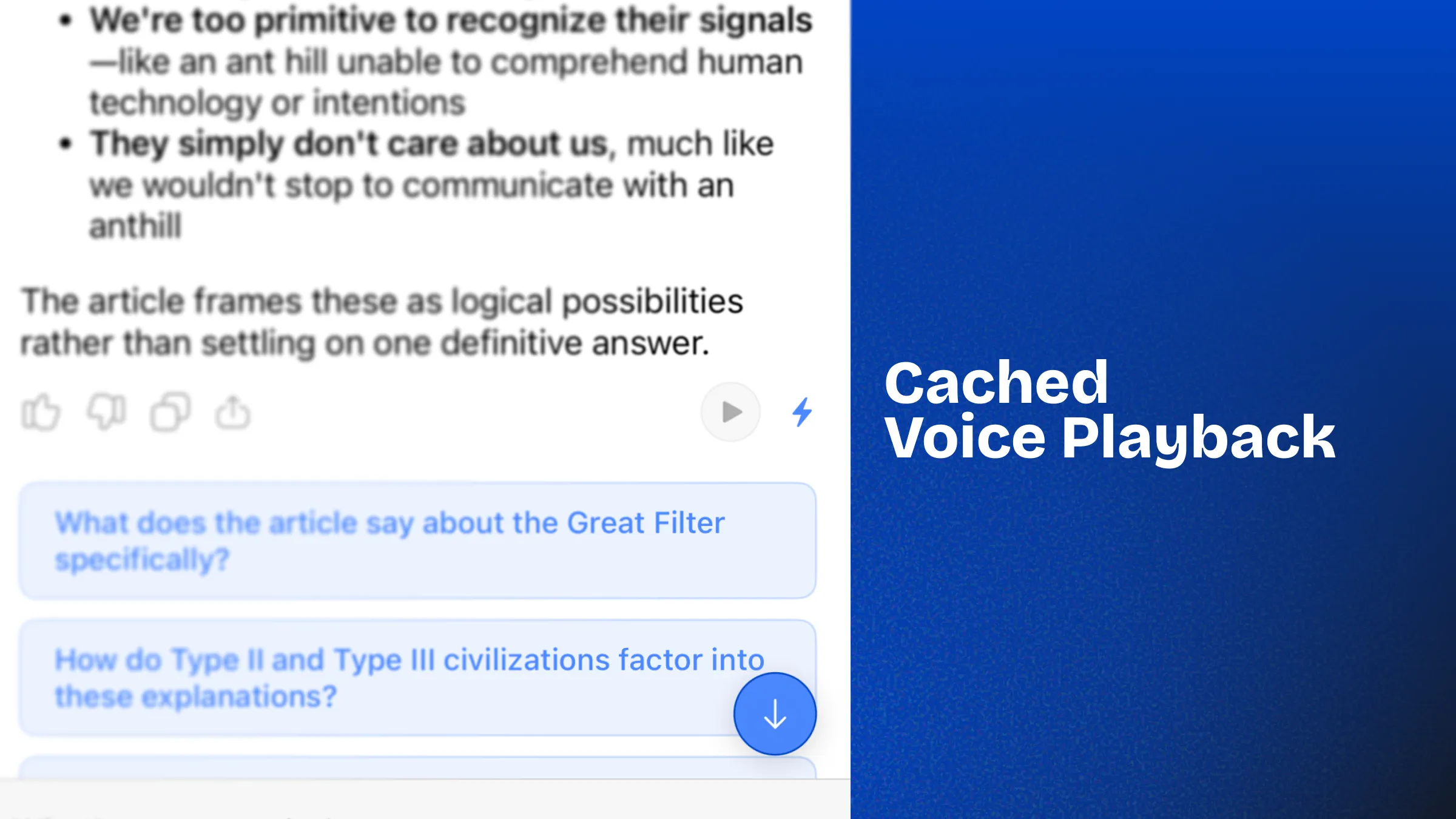However, Text-to-Speech (TTS) is a resource-intensive operation. In order to save your AI credits, I cache the entire generated audio file so you can access it anytime, even offline. The Bolt ⚡️ symbol represents exactly this: if you've generated the audio before, it lets you know it is securely cached and will load instantly when you are ready to listen.