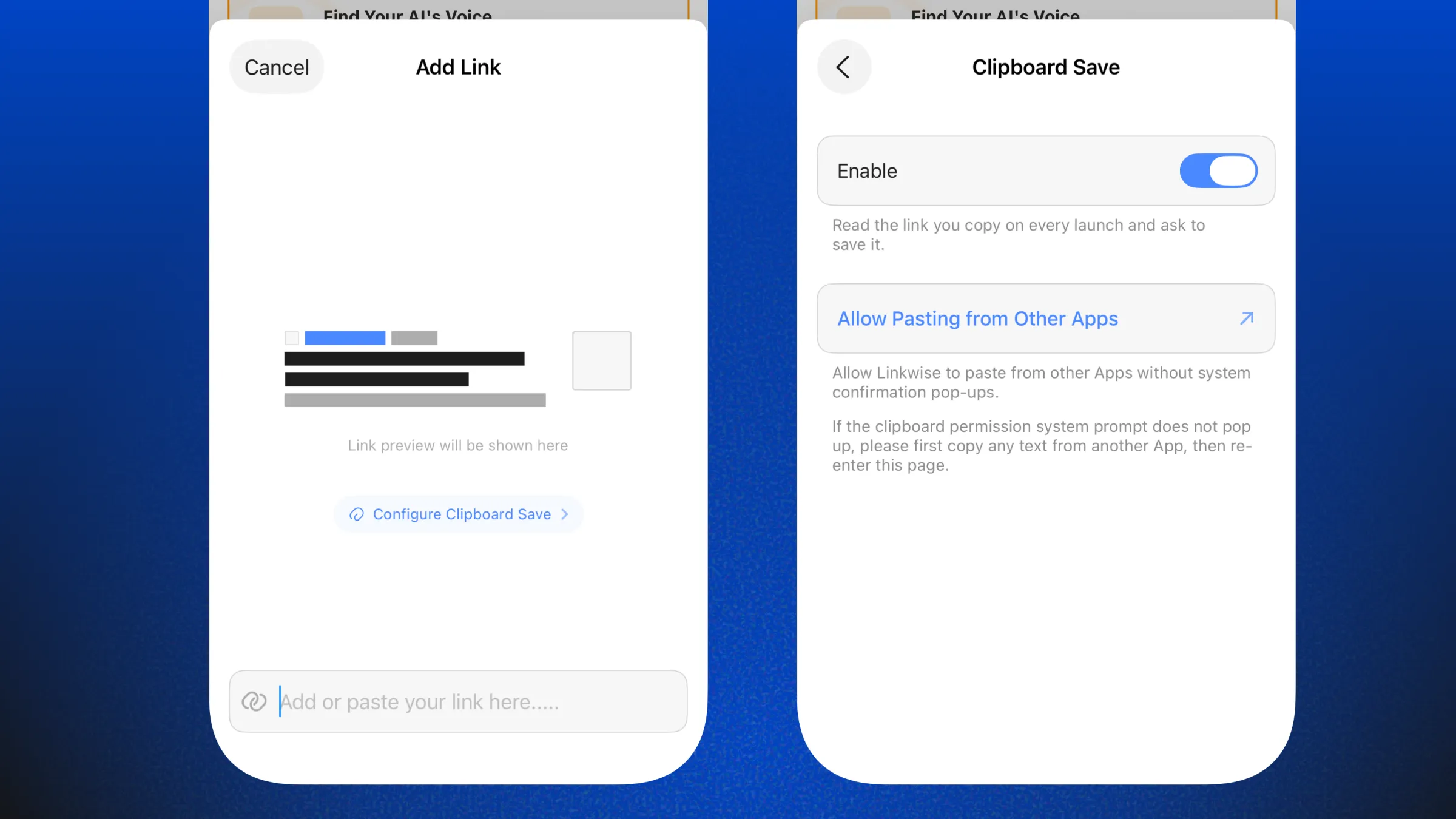 When adding a link manually, you can just type the domain name, and Linkwise will elegantly prefill the rest. Even better, you can paste a link directly from your clipboard without any extra taps. To unlock this frictionless experience, you only need to enable the clipboard save permission once, which you can access directly from the Add Link modal.