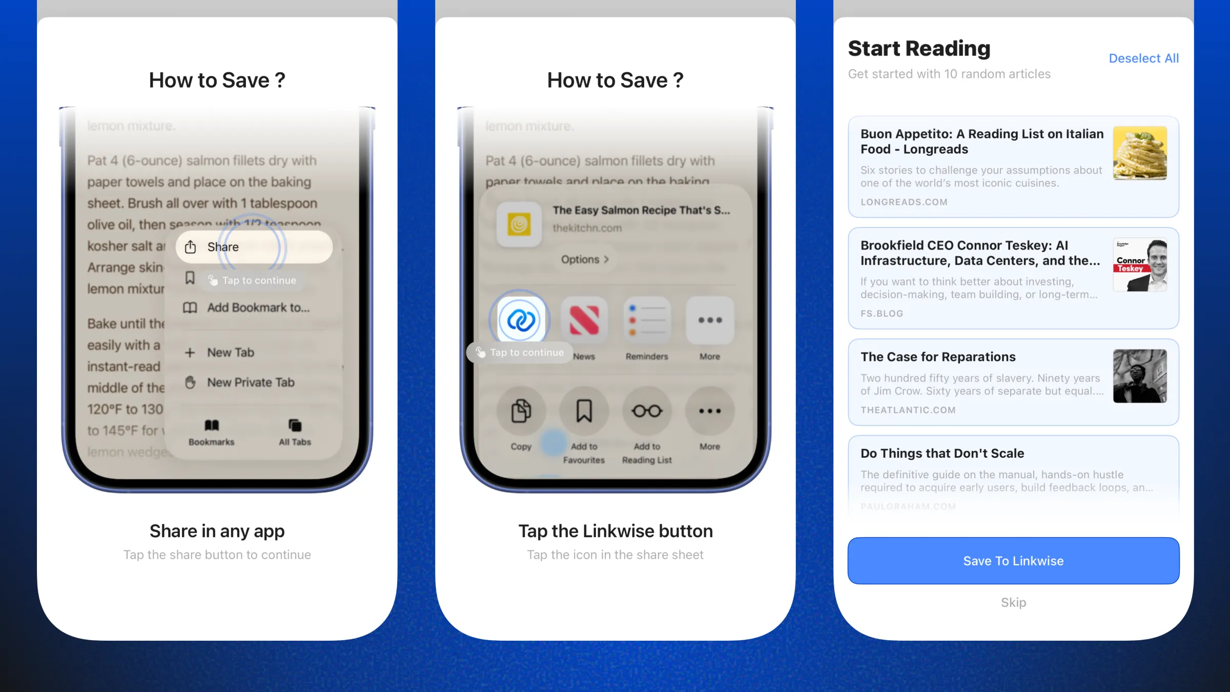 If you're a new user logging in for the first time, you'll see a walkthrough of how you can save links using the iOS Share extension. You'll also see my top 10 selected articles that you can add directly to Linkwise. This lets you start exploring features immediately, whether that's generating insights, having a conversation with the articles, or managing your collections.
